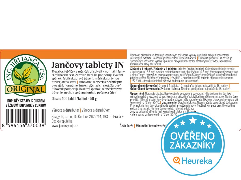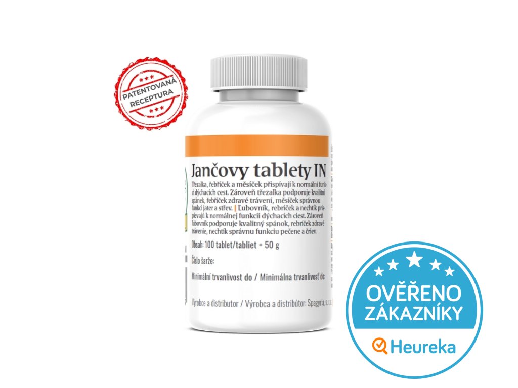 Jančovy tablety IN působí při nespavosti, nachlazení čelních dutin a pomáhají vnitřním orgánům. Tablety jsou připraveny podle originální receptury legendárního českého léčitele Ing. Jiřího Janči, CSc.